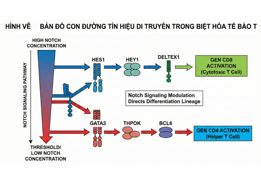Hình: Bản đồ con đường tín hiệu di truyền trong biệt hóa tế bào T. Một sơ đồ chi tiết thể hiện các phân tử trung gian trong con đường Notch. Mũi tên xanh thể hiện sự kích hoạt gen CD8 khi Notch cao, và mũi tên đỏ thể hiện sự chuyển hướng sang gen CD4 khi nồng độ Notch được điều chỉnh giảm xuống mức ngưỡng.