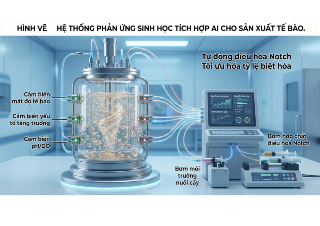 Hình : Hệ thống phản ứng sinh học tích hợp AI cho sản xuất tế bào. Minh họa một thiết bị bioreactor hiện đại với các cảm biến quang học theo dõi mật độ tế bào và nồng độ các yếu tố tăng trưởng theo thời gian thực. Hệ thống tự động bơm các hợp chất điều hòa Notch để đảm bảo tỷ lệ biệt hóa CD4/CD8 tối ưu.