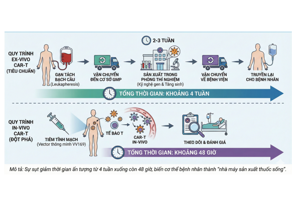 Hình: Quy trình biến cơ thể thành nhà máy CAR-T. Một sơ đồ dòng thời gian so sánh giữa Ex-vivo (trên) và In-vivo (dưới). Quy trình In-vivo chỉ bao gồm 2 bước: Tiêm tĩnh mạch và Theo dõi, nhấn mạnh sự sụt giảm thời gian từ 4 tuần xuống còn 48 giờ.