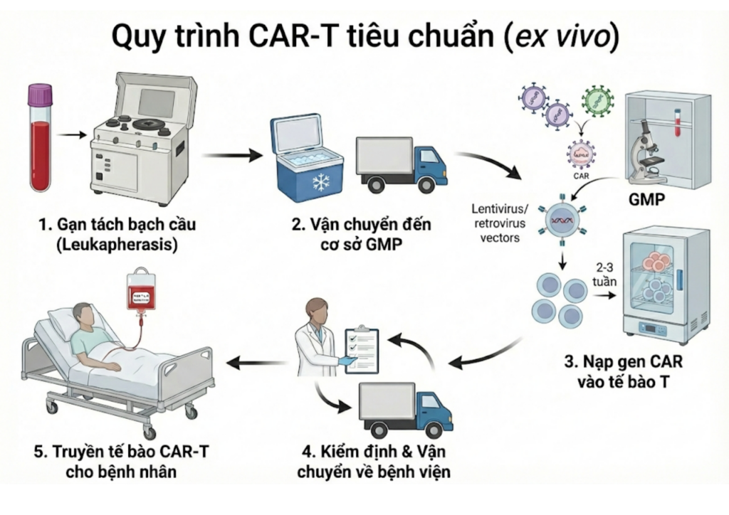 Để hiểu được tầm quan trọng của đột phá này, cần nhìn vào quy trình CAR-T tiêu chuẩn (ex vivo) hiện nay. Bệnh nhân phải trải qua quá trình gạn tách bạch cầu (leukapherasis), sau đó tế bào T được vận chuyển đến một cơ sở sản xuất đạt chuẩn GMP cực kỳ đắt đỏ. Tại đây, lentivirus hoặc retrovirus được sử dụng để nạp gen CAR vào tế bào T, tế bào sau đó được nuôi cấy tăng sinh trong 2-3 tuần trước khi được kiểm định và gửi ngược lại bệnh viện để truyền cho bệnh nhân. Quy trình này không chỉ tốn kém (thường trên 400.000 USD/liều) mà còn tiềm ẩn nguy cơ bệnh tiến triển trong thời gian chờ đợi.