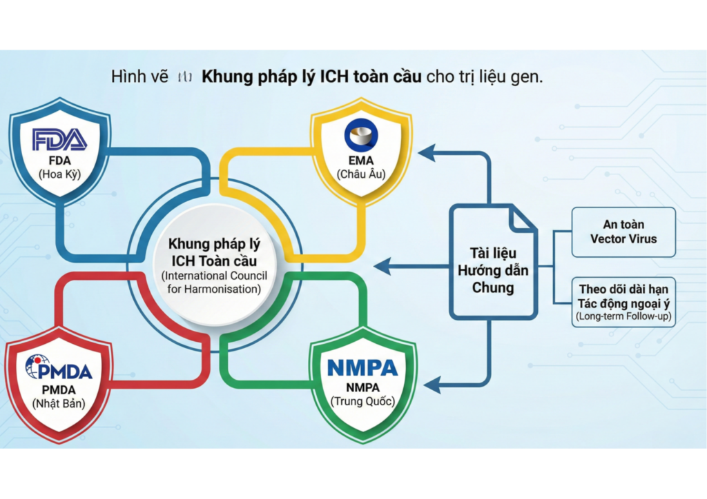 Hình: Khung pháp lý ICH toàn cầu cho trị liệu gen. Một mạng lưới kết nối FDA, EMA, PMDA và NMPA, với các tài liệu hướng dẫn chung về an toàn vector virus và theo dõi dài hạn các tác động ngoại ý