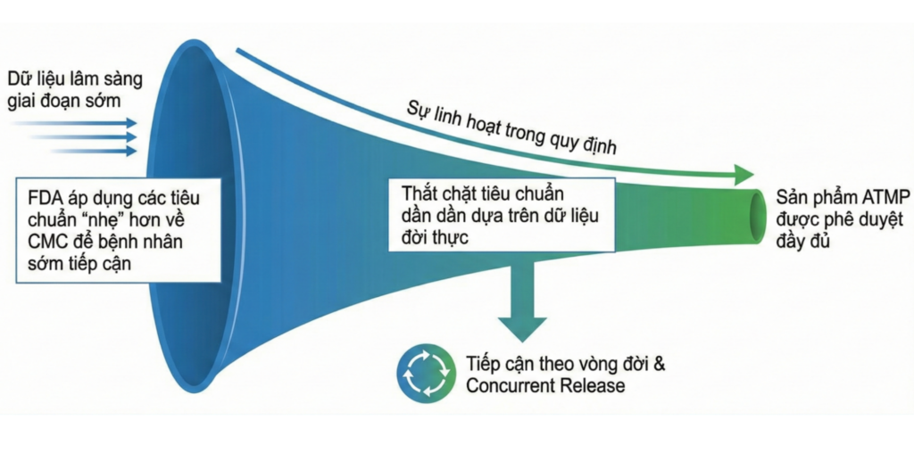 Hình: Mô hình phê duyệt thích ứng của FDA cho ATMP. Một biểu đồ hình phễu thể hiện sự linh hoạt. Ở đầu vào là dữ liệu lâm sàng giai đoạn sớm, FDA áp dụng các tiêu chuẩn “nhẹ” hơn về CMC để bệnh nhân sớm tiếp cận, sau đó thắt chặt tiêu chuẩn dần dần dựa trên dữ liệu đời thực.