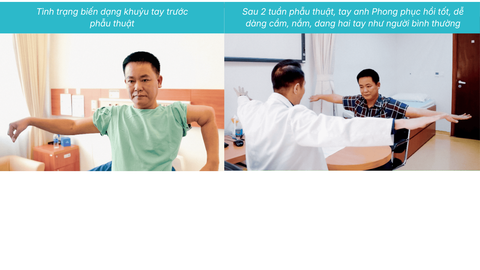 Hình: Anh Vũ Hồng Phong (47 tuổi, Thái Nguyên) là bệnh nhân được thực hiện phẫu thuật thay khớp khuỷu tay kết hợp bù xương bằng công nghệ in 3D, được thực hiện tại Bệnh viện Đa khoa Quốc tế Vinmec Times City